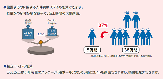 金属製ダクトにくらべて20~80%のコスト削減を実現